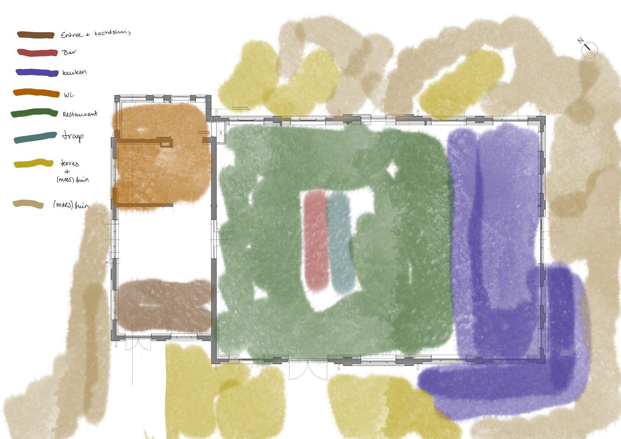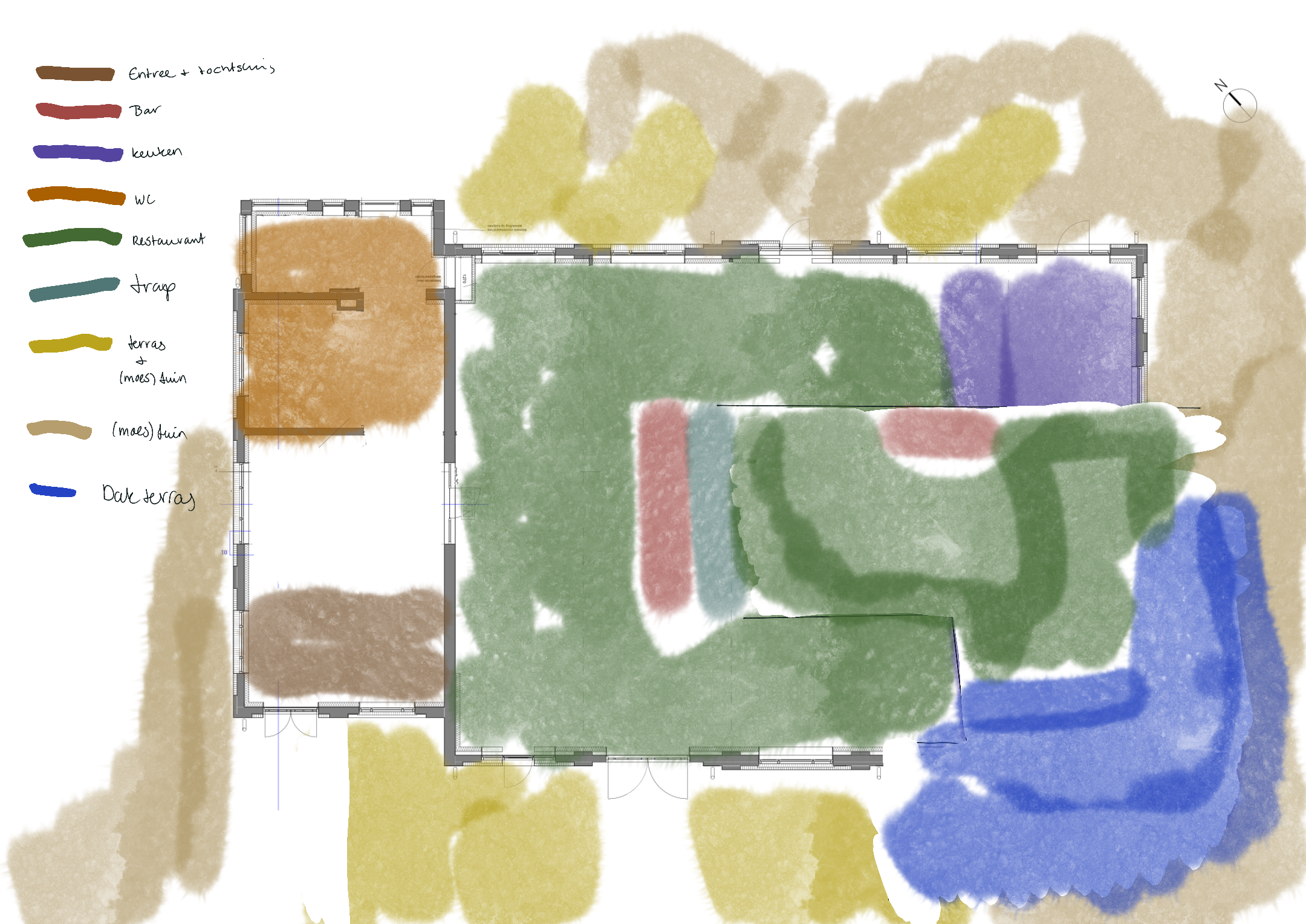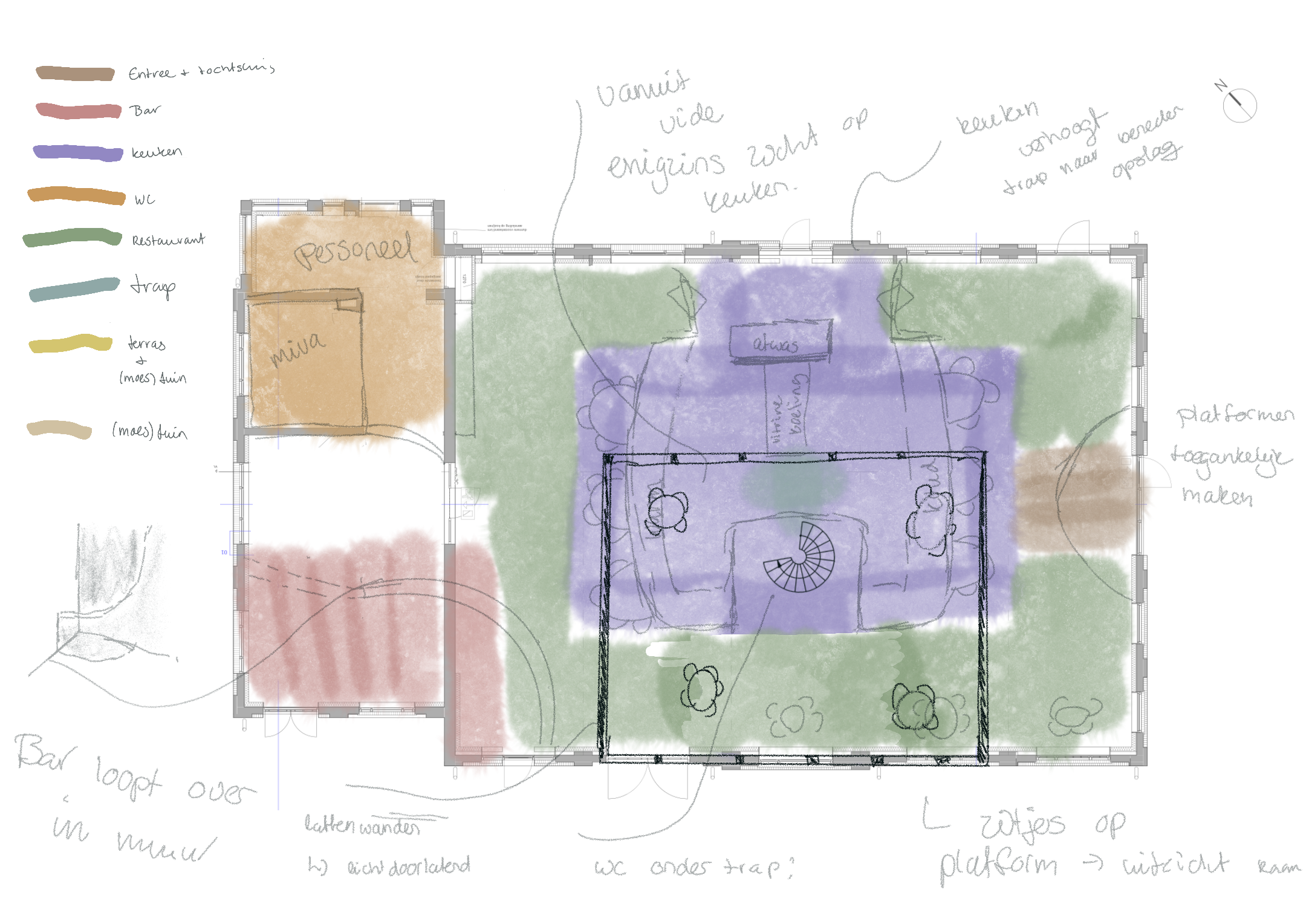 In de schetsfase stond de zoektocht naar de omgeving meenemen in het ontwerp centraal. Aanpassingen of toevoegingen aan het pand moeten logisch voelen. Er was geen ruimte te kort, een toevoeging aan het pand voelde onnodig. Een gedeelte verwijderen om zo een “uitzichtpunt” te creëren, was niet geheel passend bij het concept. En zo zou de omgeving maar in een klein gedeelte van het ontwerp meegenomen worden.