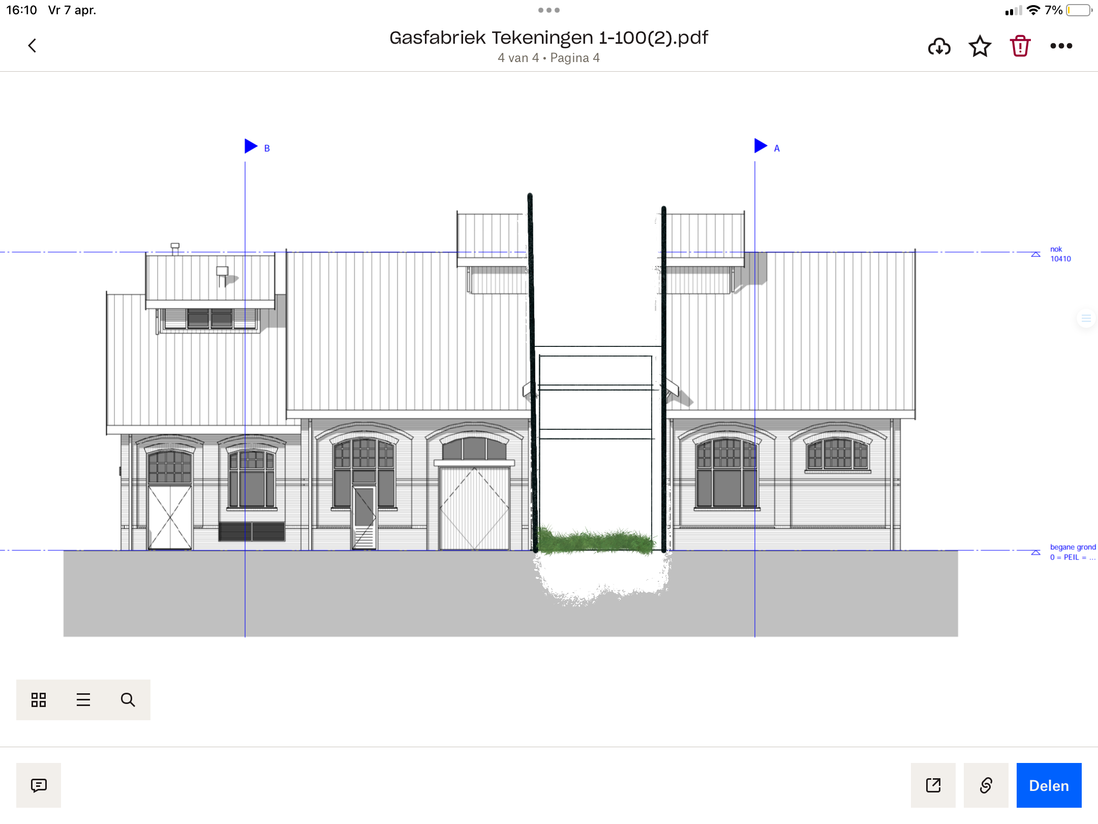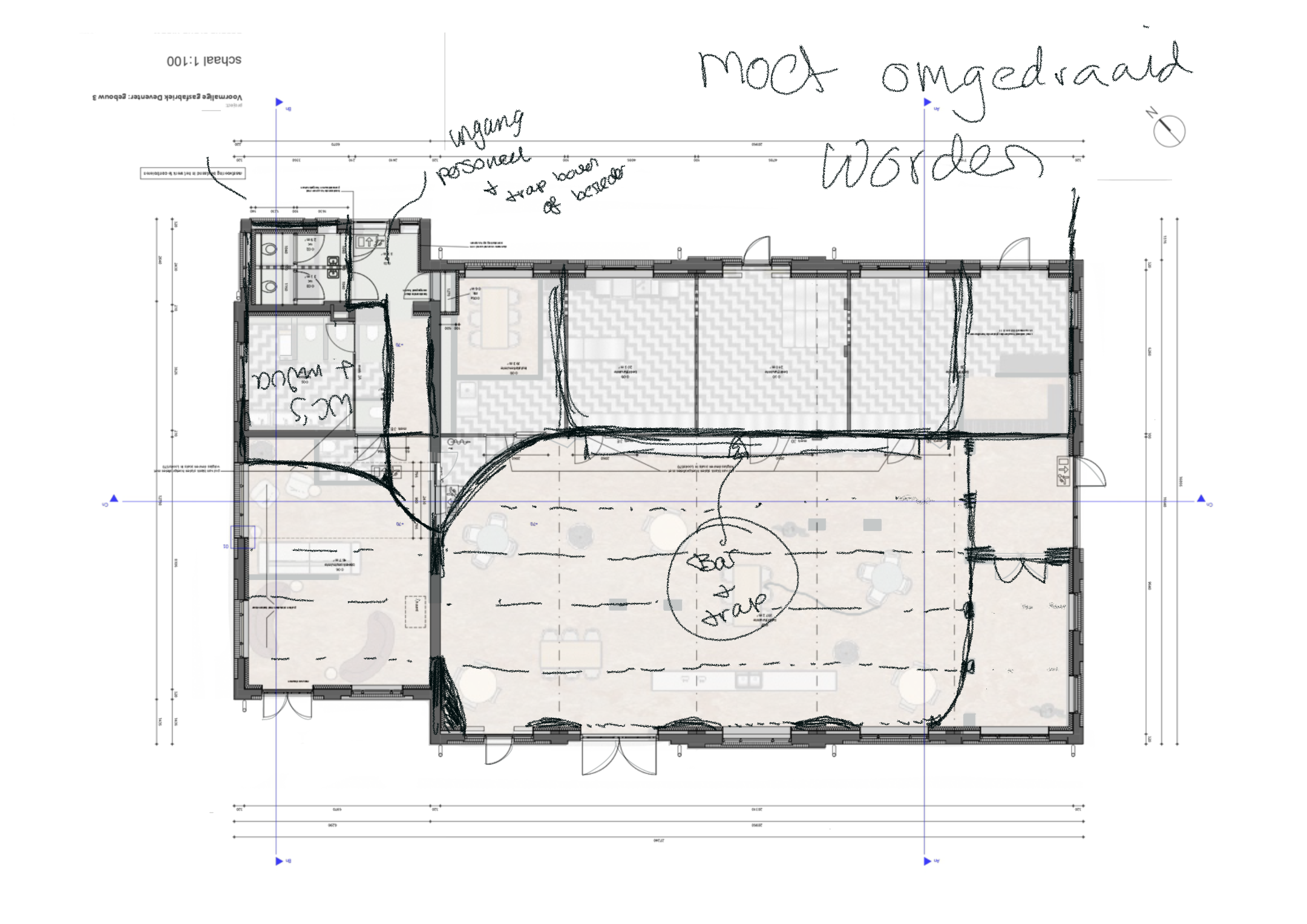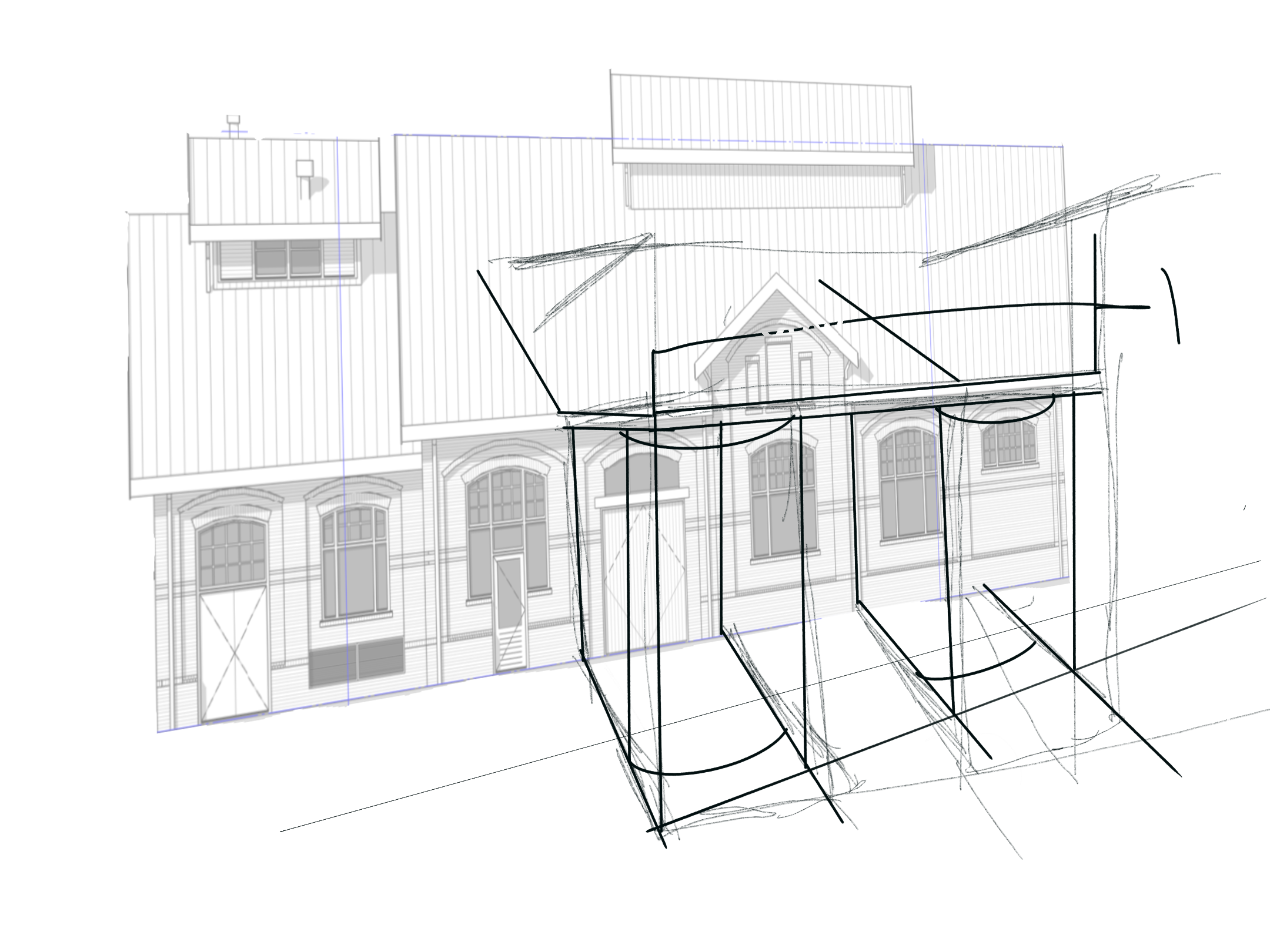 In de schetsfase stond de zoektocht naar de omgeving meenemen in het ontwerp centraal. Aanpassingen of toevoegingen aan het pand moeten logisch voelen. Er was geen ruimte te kort, een toevoeging aan het pand voelde onnodig. Een gedeelte verwijderen om zo een “uitzichtpunt” te creëren, was niet geheel passend bij het concept. En zo zou de omgeving maar in een klein gedeelte van het ontwerp meegenomen worden.